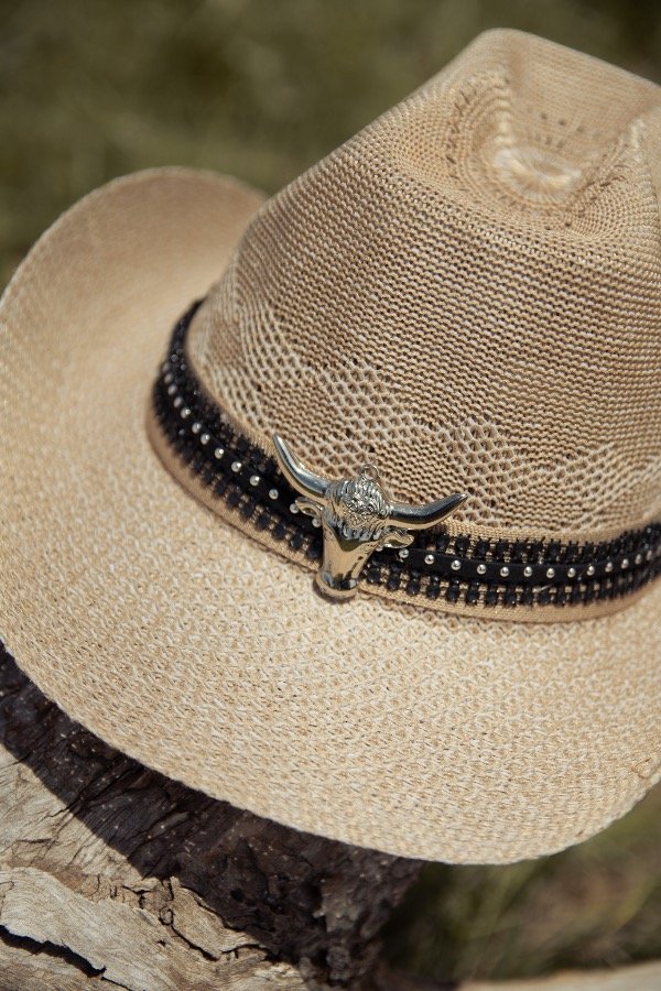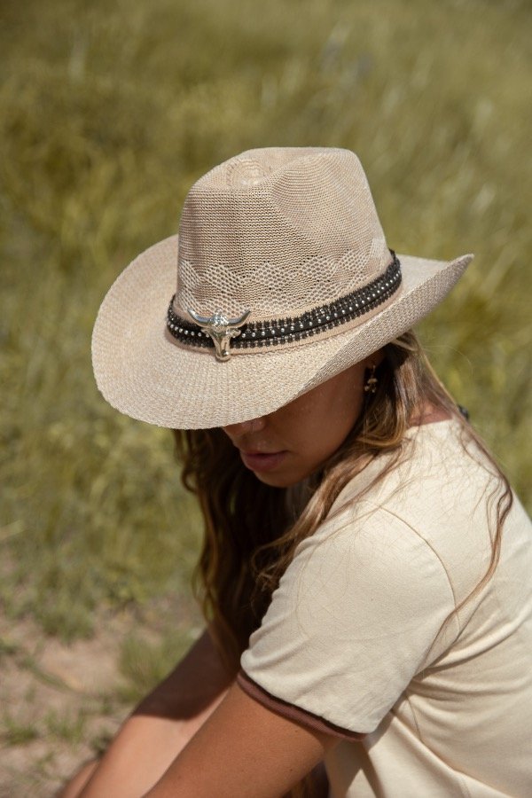 Sombrero de rafia con detalles en negro y un dije de fundición, ideal para tus looks de verano