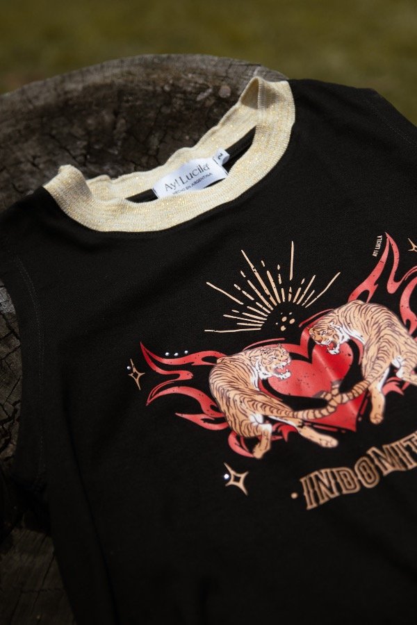Tiene una estampa exclusiva by Ay! Lucila, y un cuello tejido en lurex que suma un toque canchero, sutil pero distinto 💫